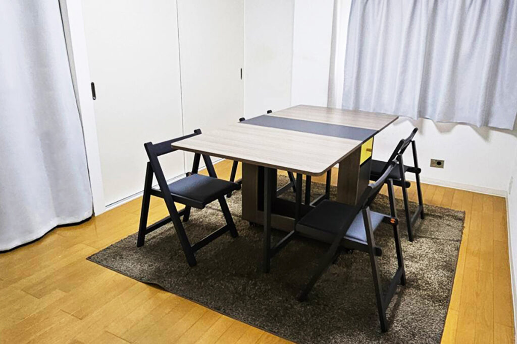 グレーを基調としたシンプルなお部屋です テーブルは折り畳み式なので床を広く使いたいときにも マットを敷いてリラクゼーションの施術等にもお使いいただけます 貸出可能備品に関してはお問い合わせください